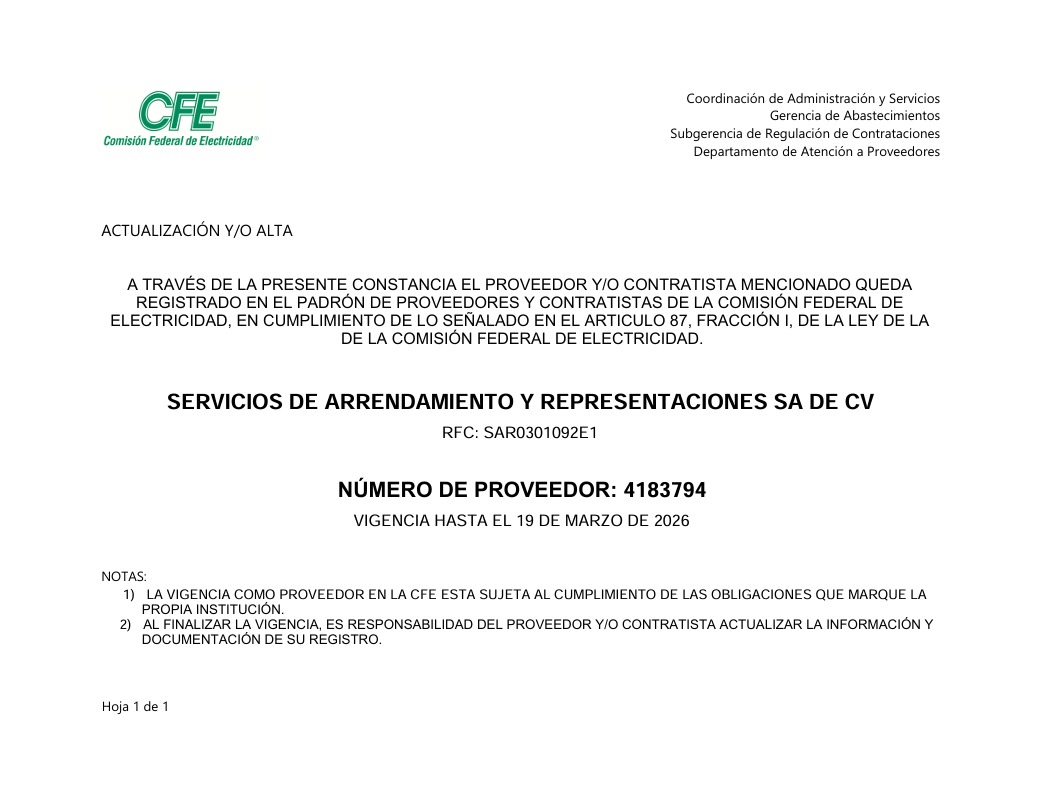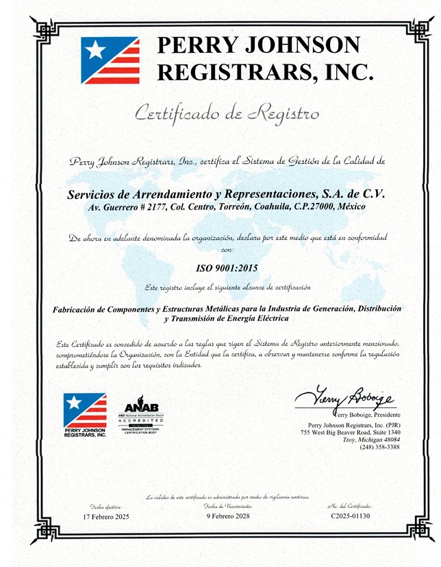 Servicios de Arrendamiento y Representaciones S.A. De C.V., dedicada a la fabricación de estructuras metálicas para subestaciones eléctricas de alta, media y baja tensión, somos una empresa comprometida en mantener la mejora continua de nuestros procesos y de nuestro sistema de gestión de calidad basado en la Norma ISO 9001:2015 cumpliendo con los requisitos aplicables de nuestros grupos de interés; con atención y asesoramiento a nuestros clientes, brindándoles productos que cumplan con sus especificaciones y necesidades en tiempo y forma.